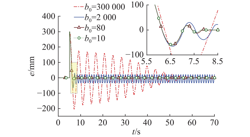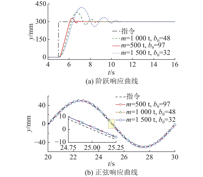 液压固有频率的大小与系统的负载质量密切相关. 对于重载系统,液压固有频率通常低于所设计的相位峰值频率;对于小负载系统,液压固有频率较高,若设计的相位峰值频率过大,可能会激发噪声干扰,为此将相位峰值频率设计为低于液压固有频率. 开展仿真与实验研究,验证本研究理论分析结果与LADRC参数设计方法.