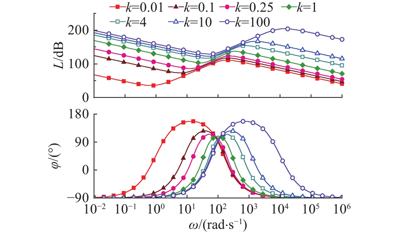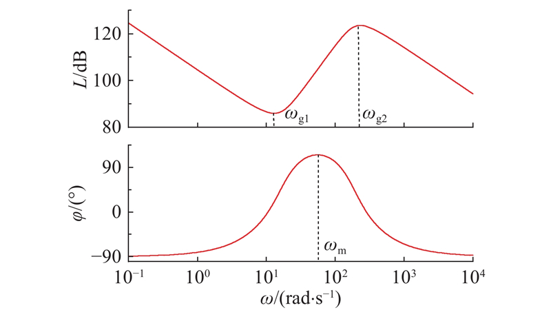 式(15)中,零极点的解析解形式复杂,不便进行频域特性分析,由于系统的零点位置与极点位置分布集中,通过韦达定理求解拐点频率ωg1、ωg2以及相位峰值频率