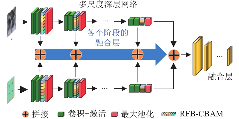 为了解决不同维度(一维信号与二维刀具磨损图像)传感信号特征提取与融合问题,本研究构建如图1所示的MSDI. MSDI采用二维卷积神经网络(2D CNN)处理数据,通过多阶段融合声信号和刀具磨损图片的特征实现深层次的网络融合. MSDI特征提取和融合的关键步骤如下. 1)输入数据通过卷积层