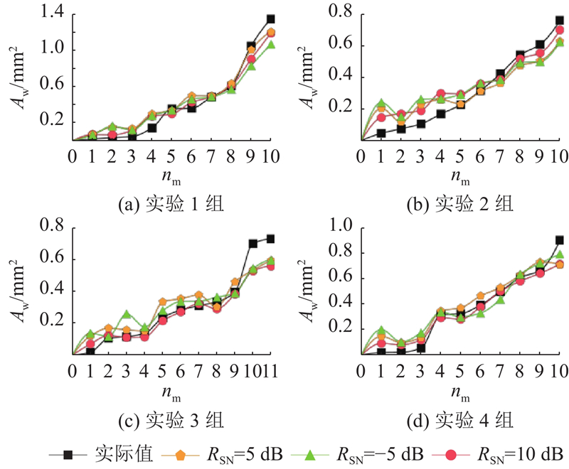 为了验证所提方法在噪声环境下对声音信号转换的适应性,设置信噪比RSN=−5、5、10 dB进行噪声模拟实验. 如图10所示为第3组实验刀具的原始信号及其在不同信噪比条件下的变化情况,对应的MTF转换图像如图11所示. 噪声模拟实验结果如图12所示. 可以看出,所提方法在4组铣削实验中均具有良好的预测性能. 在高信噪比(RSN=10 dB)条件下,各铣削参数下的预测曲线与实际磨损曲线吻合度较高,能够准确捕捉磨损趋势. 随着信噪比降低(RSN=−5、5 dB),噪声水平增大,预测曲线波动性略有提升,但整体趋势依然匹配实际值. 在图12(a)和图12(d)中,即便在RSN=−5 dB的条件下,预测结果依然能够反映磨损趋势. 由图12(b)和图12(c)可以看出,在较低信噪比条件下,模型能够稳定预测磨损状态,误差控制被在合理范围内. 尽管噪声的增加在一定程度上影响了预测精度,但所提方法在4组铣削实验和不同信噪比条件下均保持了较高的预测准确性,展示出在噪声干扰环境下的鲁棒性和适应性.