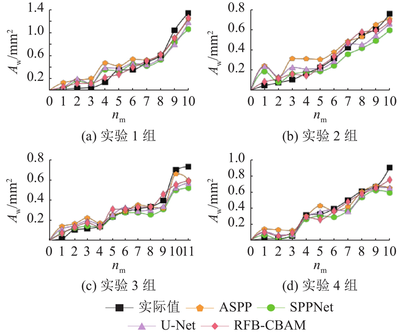 选取SPPNet、ASPP和U-Net等经典模型与RFB-CBAM进行性能对比分析,设置输入数据均为刀具图像与MTF转换后的声信号图像. 如图14和表3所示,不同模型在预测精度和稳定性方面存在差异. 整体来看,SPPNet和ASPP的预测效果相对较差,SPPNet在4组实验中MAE为