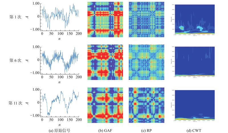 时间序列数据通过MTF转换为二维图像,以捕捉时间序列中的模式和结构特征. MTF的状态转移矩阵描述时间序列中的状态转换,马尔可夫性质(未来状态仅依赖当前状态)有效揭示时间序列的内在规律. MTF还能保留时间外的信息(不依赖时间先后顺序,但对理解序列特征至关重要的信息),在时间序列分析中有广泛应用[17]. MTF的二维化处理不仅丰富了时间序列的特征表达,还能够有效保留信号在时间维度上的状态转移信息,这些信息与其他图像数据深度融合增强了模型在多源数据融合中的特征学习能力.