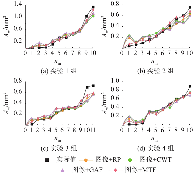 对MTF与GAF、递归图(recurrence plot, RP)和连续小波变换(continuous wavelet transform,CWT)等信号转换方式进行性能分析对比. 如图15所示为第3组实验刀具在第1次、第6次和第11次实验中GAF、RP和CWT的时间序列和图像. 从如图16所示的预测曲线能直观看到不同转换方法的拟合差异:GAF和CWT 在磨损变化剧烈的区间(如图16 (b)和图16 (c))预测曲线波动较大,即便是在图16(a)和图16(d)所示的整体及局部稳定变化区间,二者曲线也存在小幅波动,拟合一致性较弱. RP的预测曲线在图16(a)和图16(d)中整体平滑,但在局部变化迅速的时刻略显滞后,仅在磨损剧烈变化区间的表现比GAF、CWT更平稳. MTF的预测曲线在图16中保持平滑,且始终贴近实际磨损值,无明显波动或滞后. 结合如表4所示的量化指标来看,这种可视化差异进一步得到验证:GAF和CWT的R2均低于MTF,MAE与RMSE也相对更高;RP的MAE和RMSE相对较低,R2接近MTF,说明RP能较好揭示信号中的动态结构,但仍不及 MTF. 总体上,MTF在表4中的R2均超过0.9,且RMSE最低,结合图16的曲线表现可知,MTF能够有效捕捉时间序列中的状态变化,并通过与图像特征的深度融合使模型的时序特征学习能力提升.