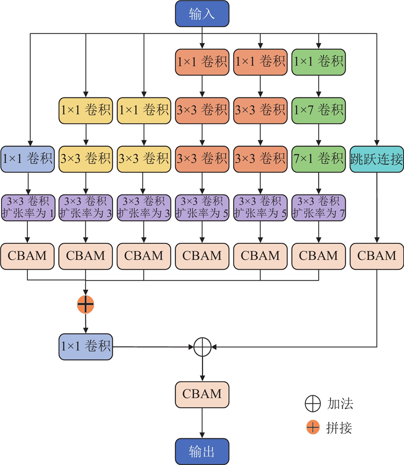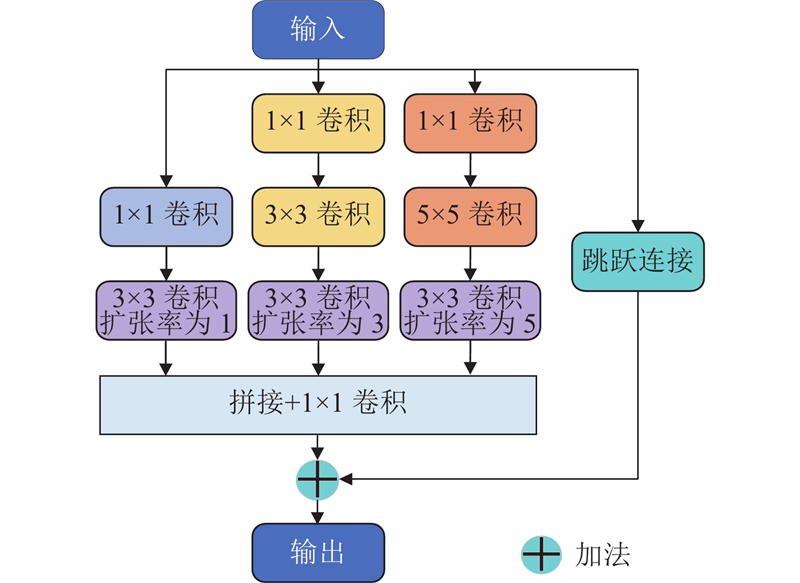 RFB通过扩展感受野(卷积核感知并提取特征的图像区域大小)增强捕获全局和局部信息的能力,在图像处理中应用广泛. RFB网络借鉴人眼在不同视觉场景下感受野的动态变化,采用不同扩张率的扩张卷积,扩展卷积核的感受范围,减少了最大池化操作导致的特征信息损失. 在如图2所示的RFB网络结构中,1)输入的级联特征图通过1×1卷积进行特征降维,以降低计算复杂度并减少冗余信息;2)网络通过不同尺寸的卷积核(如1×1和3×3非对称卷积)进行特征提取,增强特征表示;3)具有不同扩张率的稀疏卷积模拟多尺度感受野,捕获来自不同范围的特征,丰富特征表达的维度;4)特征图的拼接实现多尺度局部特征的融合.