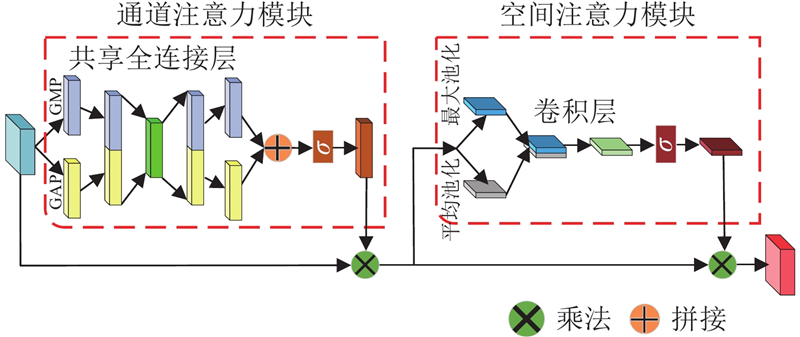 为了提升卷积神经网络在关键区域特征提取中的自适应能力,引入如图3所示的CBAM,它由通道注意力模块(channel attention module, CAM)和空间注意力模块(spatial attention module, SAM)组成. 作为增强特征提取的模块,CBAM自适应地为特征图的每个通道和空间位置赋予权重,关注任务相关的关键信息,提升网络在不同任务中的表现. CAM通过全局平均池化(global average pooling,GAP)和全局最大池化(global max pooling,GMP)生成通道描述向量,再将描述向量输入共享的多层感知机MLP,由激活函数(如ReLU)进行非线性变换,由sigmoid函数生成通道注意力权重,用于对原始特征图的各通道进行加权: