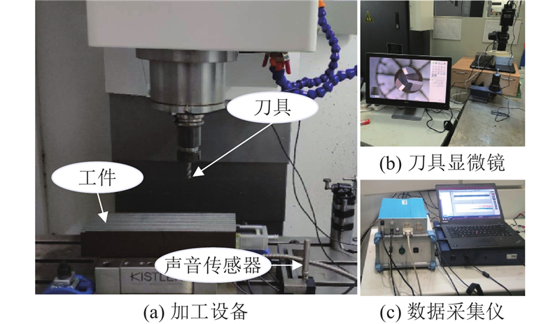 开展铣削实验,验证所提方法的有效性. 实验设备为三轴VDL850A立式加工中心(由中国大连机床集团生产),如图5所示. 实验用加工刀具:直径为10 mm、螺旋角为45°的三齿无涂层钨钢端铣刀. 实验工件选用45#钢,尺寸为300 mm×100 mm×80 mm. 如图6所示,使用声音传感器捕捉刀具与工件接触时产生的声音信号;数据采集系统选用亿恒ECON Avant(MI-7016)采集系统,采样频率设为12 kHz. 设置4组实验,铣削参数如表1所示,其中n为主轴转速,ap为切削深度,vf为进给速度,nm为铣削次数. 工件铣削以层为单位进行,每层工件表面铣削5条长槽,铣削路径如图7所示,在完成每层表面铣削加工后使用GP-300C刀具显微镜离线测量立铣刀的磨损值. 每组实验的刀具均从全新状态开始逐层铣削(间歇性停机并取下刀柄,测量刀具磨损状态),其中3组实验刀具铣削10层后停止实验,1组实验刀具铣削11层后停止实验.