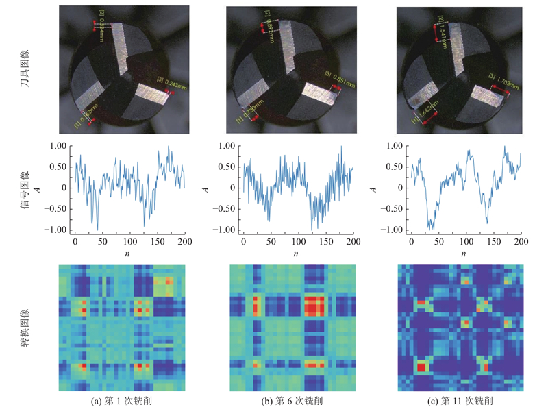 刀具工作状态的精准评估对保障切削性能、提高生产效率有重要作用[3]. 刀具磨损状态评价常用的测量方法分为2个类别:直接测量和间接测量[4]. 直接测量法是指采用光学设备和机器视觉技术直接测量刀具,通过检测刀具几何尺寸或表面纹理的变化来判断刀具当前状态[5]. 传统计算机视觉作为常用的直接测量方法,主要依赖于手工设计的特征提取和传统的机器学习分类器进行图像处理和对象识别[6-7]. 随着识别任务的日益复杂化,传统计算机视觉方法难以满足实时性要求[8]. 与传统方法相比,深度学习引入端到端学习的概念,能够自动从大量训练样本中学习特征,数据处理和特征识别能力得到提升[9-10]. Wang等[11]利用深度学习网络Faster R-CNN模型实现磨损定位和机制识别. 间接测量法主要是通过分析与刀具磨损相关的在线测量信号(切削力、声发射、振动、主轴电流和声压等)来评估刀具磨损状态[12]. 这类方法比直接测量方法的成本低,对实际加工的适应性更强. 振动信号是刀具磨损评价常用的传感手段. 史丽晨等[13]提出基于振动信号的刀具磨损预测方法,通过DRSN-BiLSTM模型显著提高了预测精度. 在信号处理中,预测精度受噪声影响,为了提高有用信息的特征提取,研究学者尝试将信号特征转换为二维图像. 滕瑞等[14]提出基于格拉姆角场编码技术(Gramian angular field,GAF)和卷积神经网络的刀具磨损值在线监测方法,有效提高了监测精度和泛化性能.