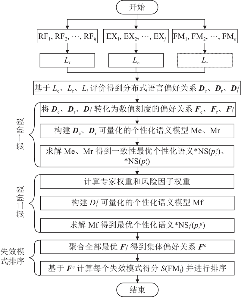 如图1所示为本研究所提方法的模型框架. 根据相应的基础数据输入进行评价,得到针对专家、风险因子以及失效模式的分布式语言偏好信息. 1)通过数值关系转换与最大化一致性水平构建量化De、Dr的个性化语义模型Me、Mr,求解模型得到针对专家、风险因子的一致性最优的个性化语义. 2)利用加权平均算子,计算得到专家、风险因子的权重数值,构建并求解个性化语义模型Mf,得到针对失效模式评价的最优个性化语义. 3)聚合全部的最优数值偏好关系得到集体偏好关系,进一步计算每个失效模式的数值得分并排序.