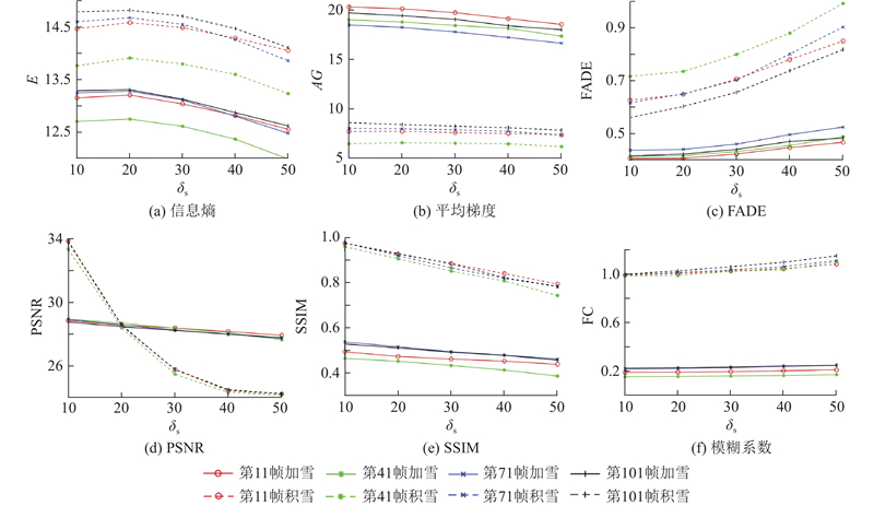 选用无参评价指标:信息熵E[14]、平均梯度AG[15]、雾感知密度评估FADE[16];有参评价指标:峰值信噪比PSNR[17]、结构相似性指数SSIM[18]、模糊系数FC[19-20]对所提算法的性能进行客观评价,各帧图像在不同雪线密度下客观评价指标曲线如图10所示. 受雪线影响,图像信息熵不断降低,FADE不断增加,由于雪线总体覆盖面积较小,平均梯度下降不明显. PSNR及SSIM均随雪线密度增大而降低,模糊系数不断增大. 由于受积雪影响,雪线对图像质量的影响降低,导致积雪条件下PSNR、SSIM及模糊系数变化缓慢. 如表1所示为各帧图像在不同雪线密度下客观评价指标的平均值. 可以看出,随着δs的增加,信息熵、平均梯度、PSNR、SSIM逐步减小,FADE和模糊系数不断增大,与实际情况相符合. 结果表明,所提算法处理可有效获得不同雪量下的雪天场景效果.