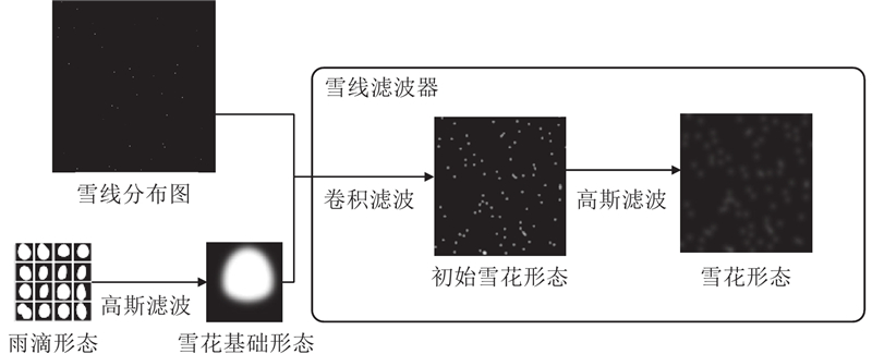 随机模拟雪线分布的位置,通过设计雪线滤波器对位置分布图进行滤波,获得单层雪线. 通过随机设置雪核信息(如雪线大小方向),融合多个单层雪线,获得多层雪天图像.