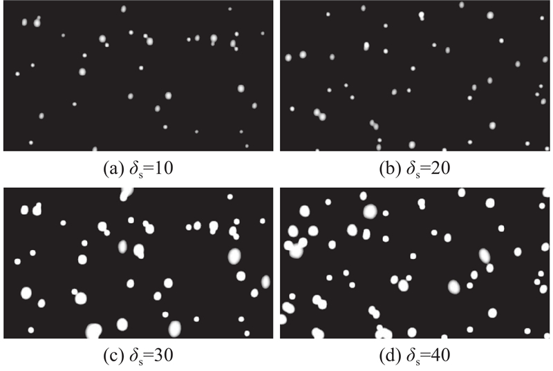 式中:SS为多源融合后的雪线效果,θr为随机角度,δs,i为单层雪线中的雪花形态. 如图6所示为不同雪线密度δs的效果图. 将积雪平面构建算法与随机雪线模型结合,得到雪天场景构建算法,计算式为