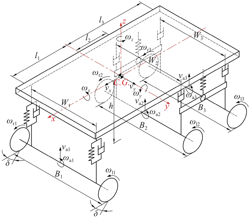 建立矿用车十七自由度动力学模型如图1所示,模型的17个自由度分别为车身的纵向、横向、侧倾、俯仰、横摆运动,3个车桥的垂向和侧倾运动以及6个车轮的旋转运动. 将车辆二、三轴平衡悬架的钢板弹簧简化为2个元件:可以绕平衡轴转动的刚性平衡梁和安装在平衡梁中间的弹簧. 根据研究对象的悬架特点,二、三轴的两侧安装有独立的减振器. 图1中,坐标系原点为车辆质心(C.G.),x轴正方向为车辆前方,y轴正方向为车辆左侧,z轴正方向为车辆上方,车辆从前向后各轴依次为一、二、三轴,vx、vy分别为车辆的纵、横向速度,ωx、ωy、ωz分别为车辆的侧倾角速度、俯仰角速度和横摆角速度,vaj、ωaj分别为各车桥的垂向速度和侧倾角速度,ωij为车轮旋转角速度,δ为前轮转角,h为车辆质心高度,Bj为各轴的轮距,Wj为各轴两侧悬架的间距,lj为车辆质心到各轴的纵向距离(下标i∈{l,r}分别代表左侧和右侧,j=1、2、3分别代表一、二、三轴). B2和B3以及W2和W3的数值相等,为了便于表达须进行区分.