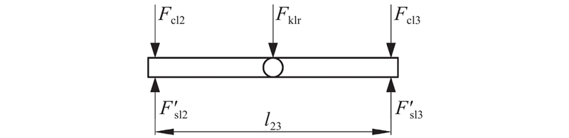 式中:F'sl2和F'sl3为作用于车桥的悬架力的反力,与Fsl2和Fsl3大小相等方向相反;Fklr为左侧平衡悬架弹力;Fcl2和Fcl3为左中、左后悬架阻尼力;l23为二轴与三轴之间的轴距,即l3和l2之差. 平衡悬架弹簧挠度