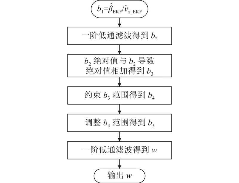 根据EKF方法和积分方法的特点,提出比例-微分融合权重系数计算方法,在此基础上对上述2种方法的估计结果进行加权融合. 当车辆颠簸较为剧烈时,融合权重系数w接近或等于1,使融合结果偏向或等于积分方法;当车辆运动状态平稳时,w接近或等于0,使融合结果偏向或等于EKF方法. 融合权重系数w的计算流程如图5所示. 图5中,b1~b5均为中间变量. 比例-微分融合权重系数计算方法选取质心侧偏角和车辆纵向速度作为车辆运动状态的评价参数,其中车辆纵向速度使用由EKF输出的纵向速度估计值