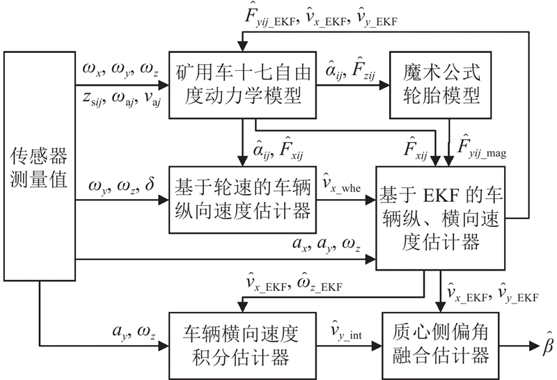 本研究所提质心侧偏角估计方法流程如图6所示. 为了确保EKF估计器信息形成闭环反馈,避免误差累积,使用车辆纵、横向速度和轮胎侧向力的EKF估计值作为矿用车十七自由度动力学模型在下一时刻的输入.