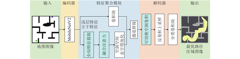 本研究提出基于语义分割的启发式采样路径规划算法,包含最优路径区域预测和路径规划2个主要步骤. 在预测阶段,设计以地图与起点终点图像为输入的最优路径区域预测网络模型(optimal path area prediction network model, OPAPN). 针对传统深度学习语义分割任务在路径规划应用中常见的全局信息缺失问题,引入全局特征提取模块以捕捉全局障碍物的布局以及起点至终点的信息. 设计融合注意力机制的模块,增强网络对地图空间信息的关注. 在解码器环节采用可切换空洞卷积(switchable atrous convolution, SAC)[17]技术,以提升网络检测不同尺度障碍物的能力. 在路径规划阶段,通过对OPAPN预测出的最优路径区域进行启发式采样来有效减少冗余采样点,借助双树扩展机制加速算法的收敛速率.