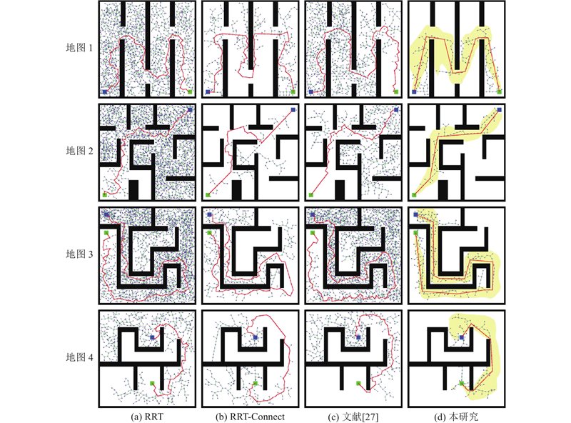 为了验证改进RRT算法在效率和搜索性能上的提升,使用Python语言将所提算法与RRT、双向RRT(RRT-Connect)及文献[27]中的算法进行对比. RRT-Connect是基于双树拓展思想的路径规划算法,通过从起点和终点同时构建2棵随机树并进行连接尝试来提高路径搜索的效率. 李金良等[27]在传统RRT算法的基础上,通过以一定的概率将目标点作为采样点来增强搜索过程,提高了算法的搜索性能和效率. 实验环境与OPAPN模型实验环境相同,对比不同算法的收敛时间和节点数量. 为了确保实验结果的可靠性,每个算法在每张地图上均运行50次,并对收敛时间和节点数量分别取平均值. 设置拓展步长为20,目标阈值为20,最大迭代次数为100 000.