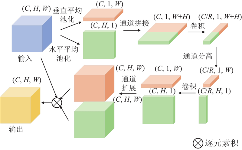 如图3所示,坐标注意力结构独立地处理输入特征图在水平与垂直方向上的信息,能够精确地捕捉空间位置数据. 坐标注意力机制显著增强了模型对全局和局部特征的感知能力,使模型在空间依赖性任务中的性能得到提升. 其中R为卷积核的感受野. 具体而言,1)对输入特征图进行水平和垂直方向的全局平均池化. 2)经过池化的特征通过一系列共享的卷积层与激活函数处理,产生分别对应水平和垂直方向的注意力权重. 3)将生成的权重调整回原始特征图的尺寸,并与输入特征图进行元素级乘法,得到加强后的输出特征图. 在预测最优路径区域的任务中,坐标注意力可以有效地捕获并利用地图内的空间定位信息,帮助模型更精准地辨识起点与终点之间的路径. 坐标注意力专注于特定坐标,有助于减轻模型对无关区域的计算压力,进而提高整体效率.