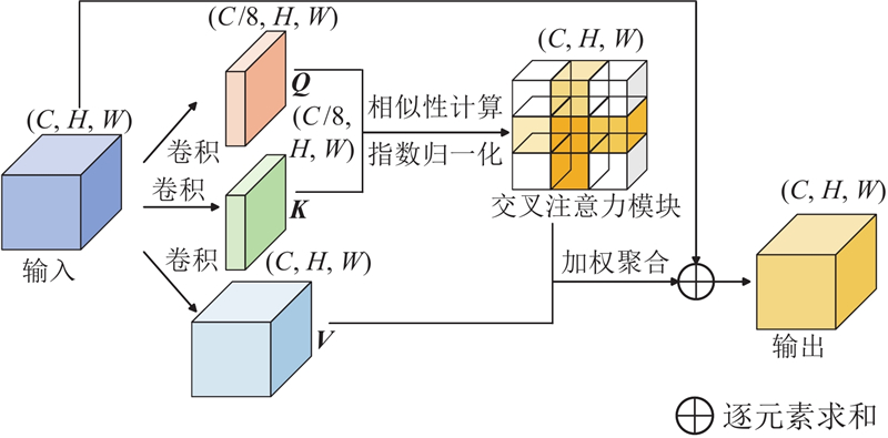 如图4所示,交叉注意力通过分别计算输入特征图在水平和垂直方向的全局注意力,有效捕获图像中的长程依赖关系,从而增强模型对全局信息的感知能力. 具体而言:1)利用卷积操作生成查询 Q、键K和值V 映射;2)在水平和垂直方向分别计算 Q 与 K 之间的相似度矩阵,并通过 Softmax 激活函数获得对应的注意力权重;3)将得到的注意力权重加权求和到 V 映射上,得到水平与垂直方向的注意力特征图;4)将水平与垂直方向的注意力特征图进行融合,并与原始输入特征图结合,形成增强的输出特征图. 交叉注意力模块能够同时建模水平与垂直方向的相关性,以全面捕获全局上下文信息,为模型提供更丰富的上下文特征表达,提升复杂场景下的特征建模能力.