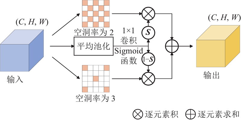 通过在卷积核之间插入空洞,空洞卷积[23]可以在不增加额外参数的条件下扩大感受野,从而帮助模型捕获更广泛的上下文信息. 这对于预测地图中的最优路径区域尤为重要,原因是空洞卷积可以全面地感知环境中的阻碍,减少因局部信息不足带来的影响. 将可切换空洞卷积引入预测模型,进一步增强感受野的灵活性并保留细节信息. 在解码器模块中,整合如图6所示的SAC技术能够提高预测区域边界的平滑度. 在模块初始化阶段,模型创建2个具有不同扩张率的卷积层,1个平均池化层,2个1×1的卷积层. 其中一个1×1卷积层负责输入变换,另一个用于生成权重张量