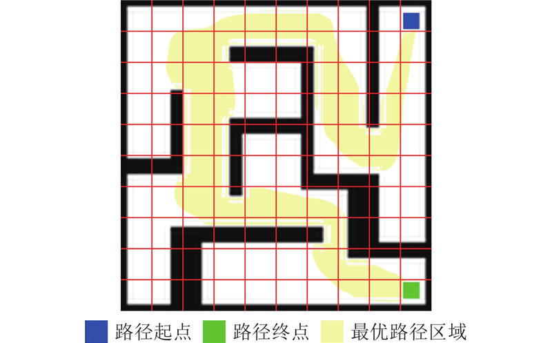 在经典RRT算法中,状态空间的不断随机采样用以探索该空间. 尽管这种方法确保了采样的概率完备性,但在复杂环境下,可能导致冗余采样. 例如,在特定的路径规划任务中,无需使路径穿过地图的所有区域,因此随机采样可能产生大量的无效节点. 为了降低这种冗余,采用启发式的、非均匀的采样策略. 如图8所示为最优路径区域地图离散化过程. 1)将OPAPN预测得到的图像作为输入,并将地图离散化为多个网格单元. 2)检查在每个网格中是否存在代表最优路径的像素. 3)将包含最优路径的像素值的网格保存在优先采样集合中. 在实施RRT算法时,优先采样集合中的坐标点被采样的可能性更高,采样函数方程为