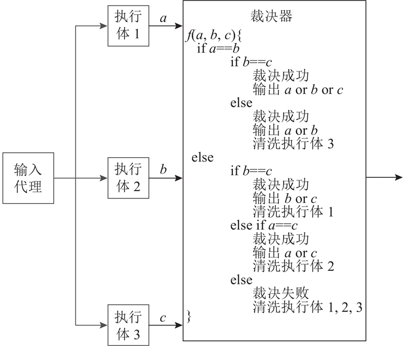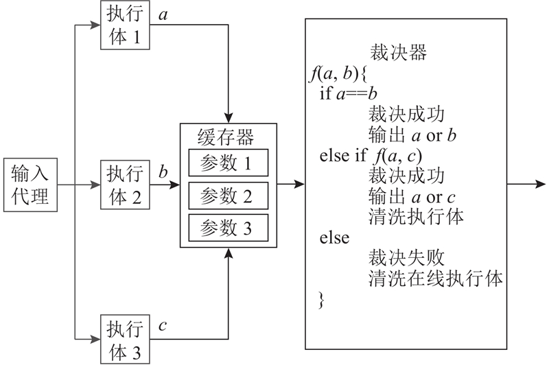 进行传统拟态裁决架构的实现机制分析. 拟态防御模拟态裁决的含义:若拟态防御系统X中包含N个执行体(N≥3),对同一输入N个执行体响应输出值均进行一致性判定,从而推断系统运行安全状态,称为N模裁决;对N–1个执行体响应进行一致性判定,由此推断系统运行安全状态,称为N–1模裁决,此时系统故障容许度为1,允许1个执行体不参与拟态裁决. 以Web信息系统为例,在包含3个执行体的拟态Web信息系统工程实现中,拟态裁决器通常唯一,且裁决器内须预置裁决算法. 如图1所示,Web信息系统N模裁决(N=3)包含输入代理、执行体、裁决器等拟态信息系统基础组件,输入代理将Web请求发送至执行体1、2、3,分别生成响应a、b、c, N模裁决在裁决器内须定义能够对3个参数进行一致性判定的算法,并要求对所有执行体响应进行比较. 如图2所示为N–1模裁决模型. N模裁决算法可设计为兼容N–1模裁决,即在3个执行体拟态信息系统中,当1个执行体异常时,N模裁决降级为N–1模裁决. 若N–1模裁决成功,则表示系统仍处于安全运行状态,系统可继续运行而无需采取停机修复防御操作,保证拟态信息系统高可用;仅当3个执行体响应值完全相异时,裁决失败,表示系统处于非安全状态. 此外,N模裁决算法可设计为不兼容N–1模裁决,即要求所有执行体响应值相同才表示系统处于安全运行状态,保证拟态防御界内系统高安全. 图1、2中的示例算法均是支持1执行体故障容许度的高鲁棒系统拟态裁决算法. 当采用单裁决器时,预期或非预期因素(如负载过高、功能故障)均可能导致裁决器低效率运行甚至中止运行. 此时Web信息系统请求输入响应输出的通路稳定性将被破坏,Web信息系统用户将延迟收到或无法收到系统响应. 当前裁决器与执行体数量的对应关系是按经验习惯进行约定的,裁决器中的裁决算法须在拟态防御系统上线前部署完成,一旦更换执行体数量,裁决器算法须相应变化,否则将无法执行计算. 特别是在单裁决器情况下,裁决算法须在拟态防御系统下线后重新部署,极大限制了拟态防御系统的可用性与易用性.