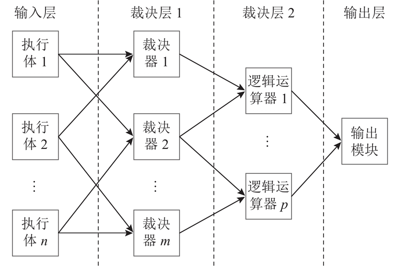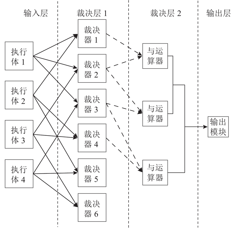借鉴三冗余投票模型与云平台服务集群的构建方法,提出如图4所示的分布式拟态裁决模型. 单一裁决器依照分布式服务集群样式进行设计,并设计执行体到裁决器的连接通路. 分布式拟态裁决模型的裁决器、逻辑运算器均为二元参数运算器,即输入参数数量均为2. 假设各裁决器、逻辑运算器均只执行单次运算,且裁决器、逻辑运算器仅执行单一裁决、单一与逻辑运算以及单一或逻辑运算功能,不具备通过计数、路径追溯分析拟态裁决组件输出值的附加功能. 裁决模型由输入层(input layer)、裁决层1(judge layer 1)、裁决层2(judge layer 2)、输出层(output layer)构成. 输入层是执行体集群层,执行体数为n(n≥3),产生待裁决的数值作为输入. 裁决层1是第一层裁决,其功能是在分布式裁决器集群中对输入层各执行体响应值是否相等进行裁决,同时完成将多元数值类型转换为布尔值的操作,裁决器内置二元比较算法,可以产生布尔值;若执行体输出值相同,则裁决器输出值为1,否则输出值为0. 设裁决器数量为m,当执行体数量为n(n≥3)时,可知本层裁决器数量