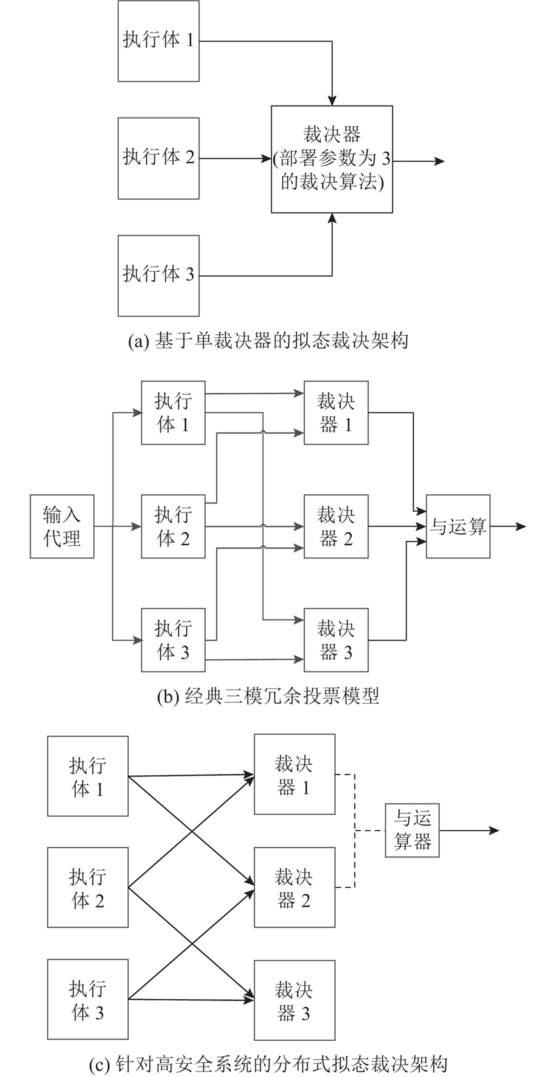图 12 不同拟态裁决架构的示意图(三冗余、故障容许度为0的信息系统)