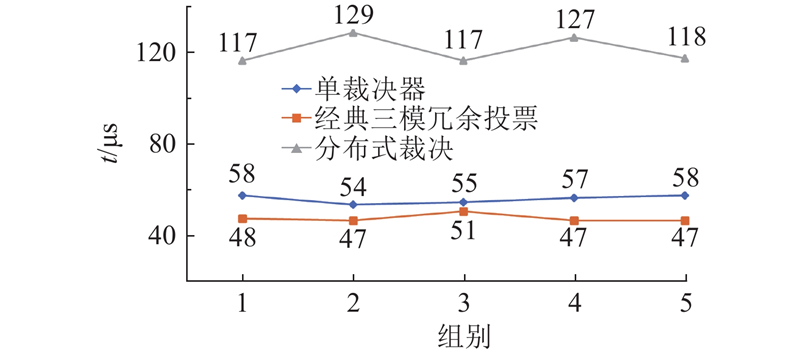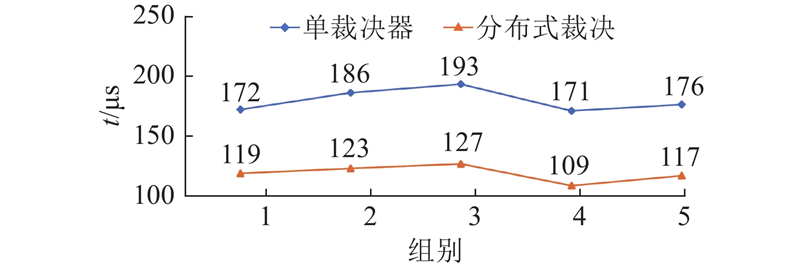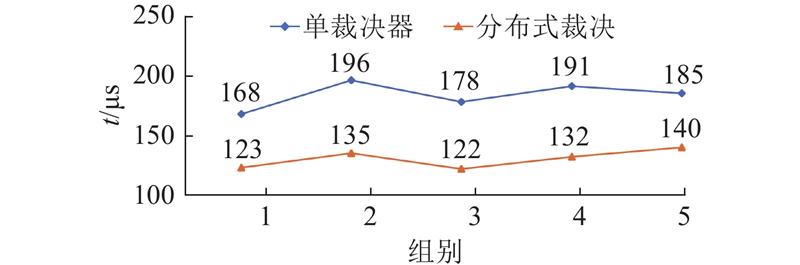 实验2:在n=4、r=1的系统中验证基于单裁决器的拟态裁决架构、针对高鲁棒系统的分布式拟态裁决架构的裁决能力及裁决间隔. 基于单裁决器的拟态裁决架构须预先设计支持4个执行体,1个故障执行体容许度的裁决算法,否则不具备自定义个数执行体的裁决能力. 在针对高鲁棒系统的分布式拟态裁决架构中, 裁决层1须部署6个裁决器,裁决层2须设置2层与运算级联拓扑结构,因此部署2个与运算器,如图14所示. 设置5组执行体输出数值,执行体输出数值第1组为(1,1,1,1),第2组为(0,1,1,1),第3组为(1,1,1,0),第4组为(0,0,1,1),第5组为(1,0,1,0),实验结果如图15和表3所示. 2类拟态裁决架构均裁决正确,分布式裁决间隔低于单裁决器,平均裁决效率相较单裁决器提高了33.74%. 在n=5、r=2的系统仿真实验中,分布式裁决在裁决结果全部正确的前提下,裁决间隔相较单裁决器平均缩短了28.92%,具体裁决间隔如图16所示.