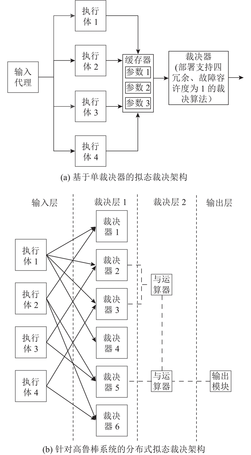 在分布式拟态裁决模型的基础上,探讨分别针对高安全系统和高鲁棒系统的分布式拟态裁决架构,构建支持用户自定义执行体数量与故障容许度的分布式拟态防御裁决架构,进一步完善裁决层1和2的裁决功能与连接拓扑设计.