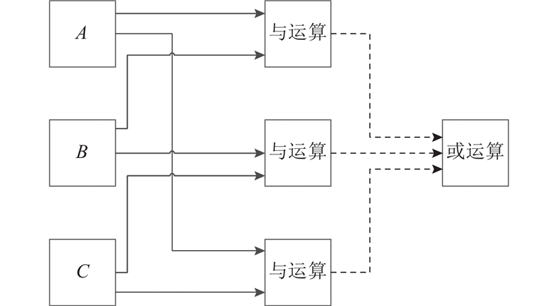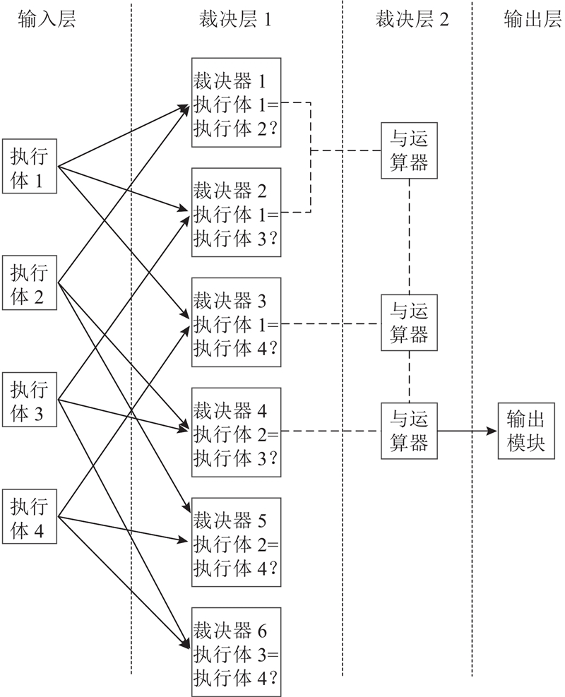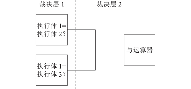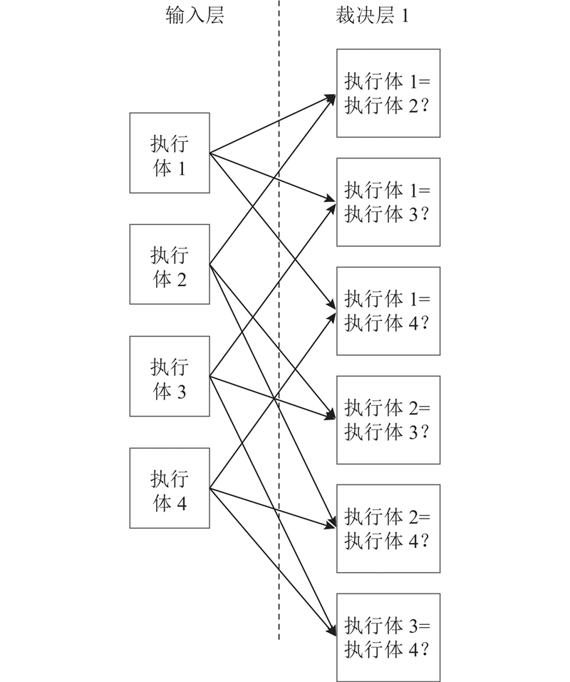 观察图7裁决层2中的与运算器裁决内容,若通过人为判断4个执行体响应值是否相等,最便捷的方法之一是当证明执行体1与执行体2的数值相等,执行体1与执行体3的数值相等,执行体1与执行体4的数值相等时,即可完成所有执行体数值相等的证明. 也就是说,证明系统安全运行最少需要3次等值证明. 这是否表示在裁决层2中设置3个与运算器即可完成拟态裁决呢?在拟态裁决系统实际执行裁决的过程中,无法确定输入层中的执行体产生数值的顺序. 如在四冗余系统中,若顺序输入至裁决层2中与运算器的数值为执行体1与执行体2数值相等,执行体1与执行体3数值相等,执行体2与执行体3数值相等,由于执行体4数值缺失,导致在高安全模式下仅凭3个与运算器无法正确地判定拟态防御界内系统的运行状态. 若能找到保障所有执行体数值输入裁决层2中的方法,则可提供进一步优化裁决层运算效率的思路. 上文已推断出当有1个执行体异常时,(n–1)个裁决器输出值为0;反之,若裁决层2中参与与运算的裁决器为