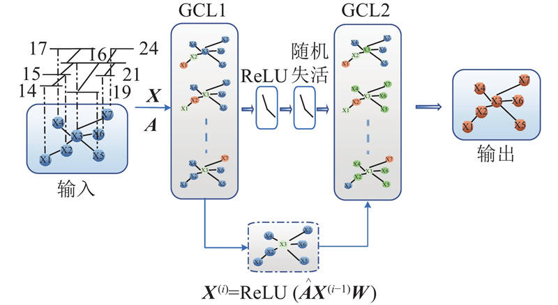 GCN充分利用节点之间的关联信息对节点间的电压和电流特征进行更新和聚合,并通过优化模型的损失函数来提高故障诊断的准确性. GCN是用于处理图数据的深度学习模型,结构如图2所示. 输入层的输入一般有2个:1)特征矩阵
