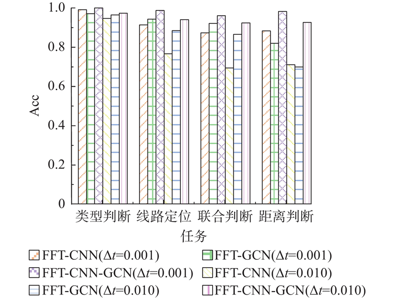 比较多模块组合模型在不同任务上的性能,参与模型包括FFT-CNN、FFT-GCN、FFT-CNN-GCN、CNN、GCN和CNN-GCN. 如图6所示,FFT-CNN和FFT-GCN的Acc比未使用FFT的CNN和GCN模型的高,FFT-CNN-GCN的Acc比未使用FFT的融合网络模型CNN-GCN的高,这说明加入FFT后的模型在频域特征的提取上表现更佳. 在故障类型判断任务中,所提模型的Acc=0.998 4,优于其他模型. 对于故障线路定位任务,所提模型同样表现出色,Acc=0.985 3. 在故障类型判断和线路定位的联合判断任务中,所提模型的Acc=0.959 2,证明了该模型在综合特征提取方面的强大能力. 在故障距离判断任务中,所提模型的Acc=0.980 4,高于其他模型组合. 本研究所提模型综合利用FFT和深度学习技术,在参与对比的模型中综合性能最佳,进一步验证了该模型在提升模型精度和鲁棒性方面的有效性.