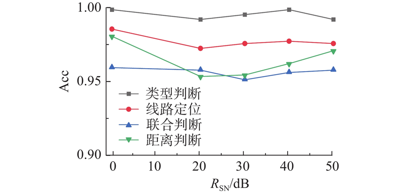 如图8所示,对比所提模型在无噪声及信噪比RSN=20、30、40、50 dB条件下的故障诊断类型识别、故障线路定位、类型和线路联合识别、准确率. 可以看出,所提模型在噪声影响下的Acc相对稳定,展示出较强的鲁棒性,能够有效适应不同噪声水平. 该模型通过在训练过程中自我调整以适应含噪声的数据,能够从数据中提取时域、频域、时间和空间的复杂特征,从而在噪声环境下仍然性能表现良好.