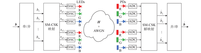 为了提高基于CSK调制的VLC系统传输质量,引入SM来传输三维光强度空间的扩展CSK符号. 如图1所示为基于SM-CSK映射的VLC系统模型. 发送的数据序列