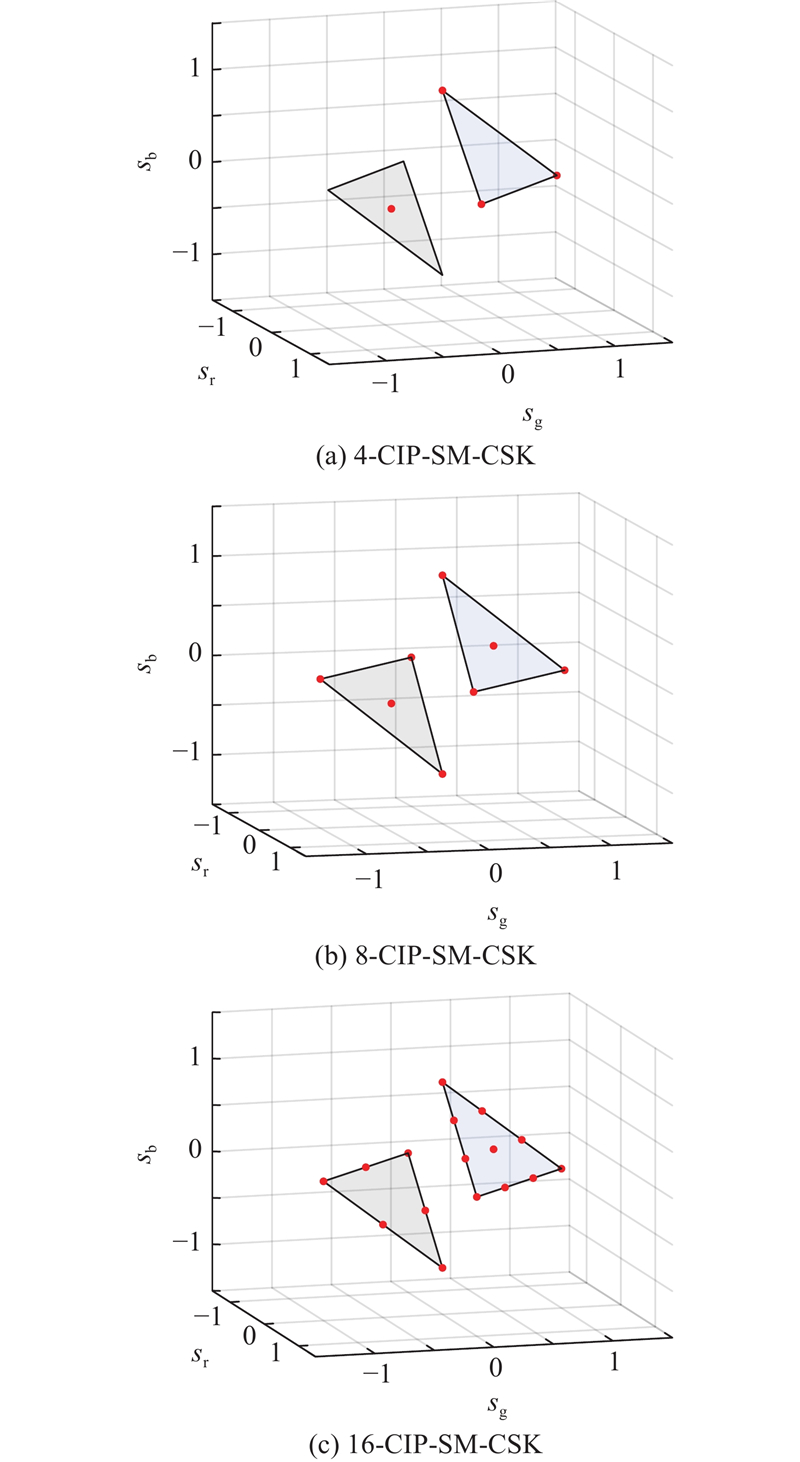 恒定强度面SM-CSK(constant intensity plane-based SM-CSK, CIP-SM-CSK)星座的主要设计思路:在恒定光强度和白光约束下,通过增大三维光强度空间中CIP-SM-CSK符号的MED来提高VLC系统的信号传输质量. CIP-SM-CSK星座的MED为