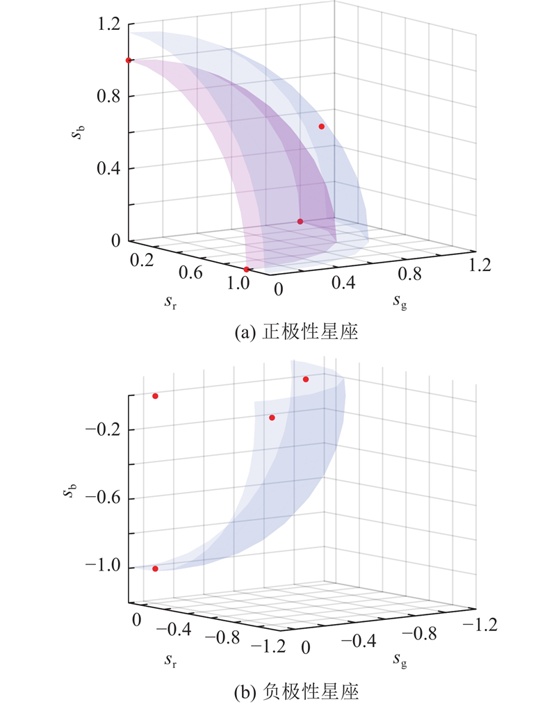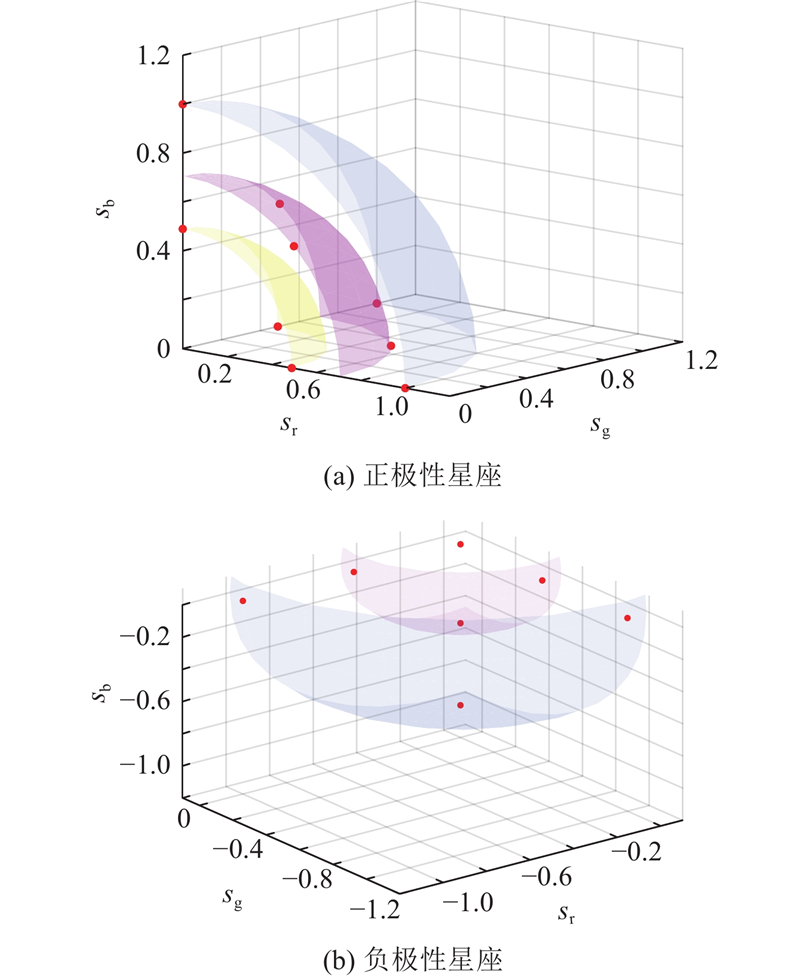IEEE 802.15.7标准提供了开关键控、脉冲位置调制、脉冲振幅调制和色移键控(color-shift keying,CSK)等多种调制方案. CSK通过变化红/绿/蓝(R/G/B)LED光强度形成不同调制符号来传输数据. 作为恒定光强度调制方式,CSK可以有效避免人眼感知的LED闪烁特性[3]. 同时,相比于白光LED,多色LEDs的光谱效率更高[4]. 学者对基于恒定光强度平面的CSK进行了深入研究,以最大化最小欧式距离(minimum Euclidean distance,MED)为目标函数优化设计CSK星座来改善VLC系统性能[5-9]. 为了充分利用三维光强度空间的特性,Chen等[10-13]对基于多强度平面的CSK星座进行优化设计,提高了VLC系统的传输质量. Wang等[14]研究用户随机接入方向下的CSK星座设计方法. 一般情况下,当最大光强度闪烁时间周期小于5 ms时,人眼察觉不到闪烁变化[15];VLC作为高数据传输系统满足最大光强度闪烁时间周期要求. 由于VLC系统受限于强度调制/直接检测方式,发送信号仅能取实正值. 为了克服该问题,Wang等[16-19]通过研究VLC系统中改进的空间调制(spatial modulation,SM)来提高系统的频谱效率与可靠性. 调制技术的研究工作主要集中于基于振幅调制的VLC系统. CSK作为VLC中的高效调制方式,与SM结合进行星座设计对提高系统性能具有重要意义.