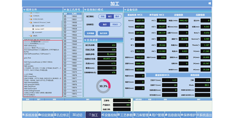 机器人加工控制软件接收完整的任务规划结果NC代码文件. 主界面(见图11)的左侧框内显示原子任务序列,用于跟踪现场加工任务的执行情况. 任务进度模块显示当前孔序号、执行任务以及工艺约束等信息. 右侧的设备信息模块显示机器人和末端执行器的实时状态.