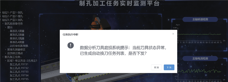 现场的任务执行智能监测模块主要监测制孔刀具状况,已部署在某飞机装配厂园区网,在接入本任务管理与规划集成系统后,用于指导重规划. 重规划的系统状态监控线程在原子任务下发至机器人加工控制软件时同步开启,检测到系统状态改变时触发.