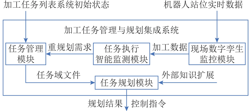 加工系统的核心部分为任务管理与规划集成系统,内部架构如图2所示,多个模块协同工作,每个模块负责特定的功能,通过信息流进行相互协作. 现场的数字孪生监控模块以数字线程通信框架为数据通道,实时监控现场状态,接收站位实时数据. 通过对任务执行过程中的加工数据进行智能监测,决定是否产生任务重规划的需求. 任务管理模块负责接收和管理装配任务,将系统使能状态和装配任务作为输入传递给任务规划模块,负责接收可能的重规划需求. 通过任务规划模块,生成规划结果和控制指令. 该系统能够保障任务表达的语义一致性、任务管理和规划的集成性,确保任务执行的鲁棒性及生产状态监控的持续性,提高生产效率和质量.
