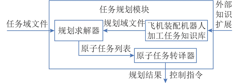 任务规划模块接收任务域文件,通过调用内部加工任务知识库形成的规划域文件,在规划求解器中得到求解结果(原子任务列表),通过原子任务转译器得到能被机器人加工控制软件直接理解并执行的控制指令. 任务规划模块的整体架构见图3.
