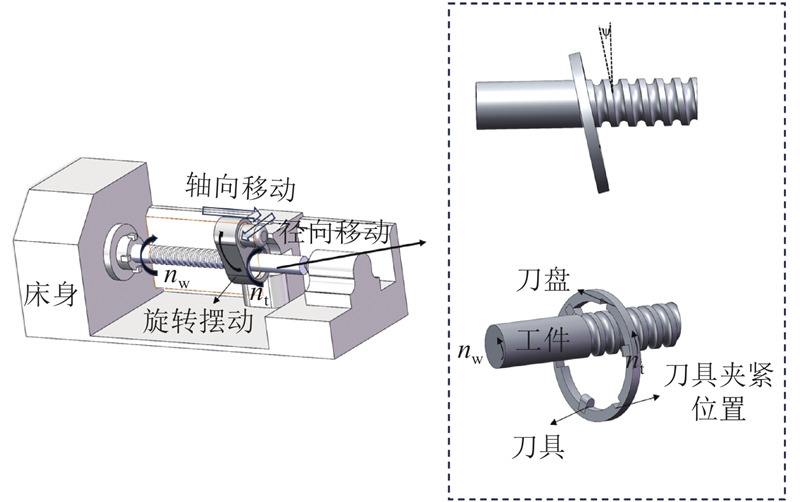 实验在数控旋风铣削加工中心(型号“HJ092X80”,汉江机床有限公司)中进行. 螺纹干式旋铣通过安装在刀盘上的多个刀具对螺纹工件进行渐进和间歇切削. 螺纹工件的间歇切削涉及4个运动过程:刀具轴向进给运动、刀具径向平移运动、刀盘旋转运动和工件旋转运动. 丝杠旋铣加工的示意图如图1所示.