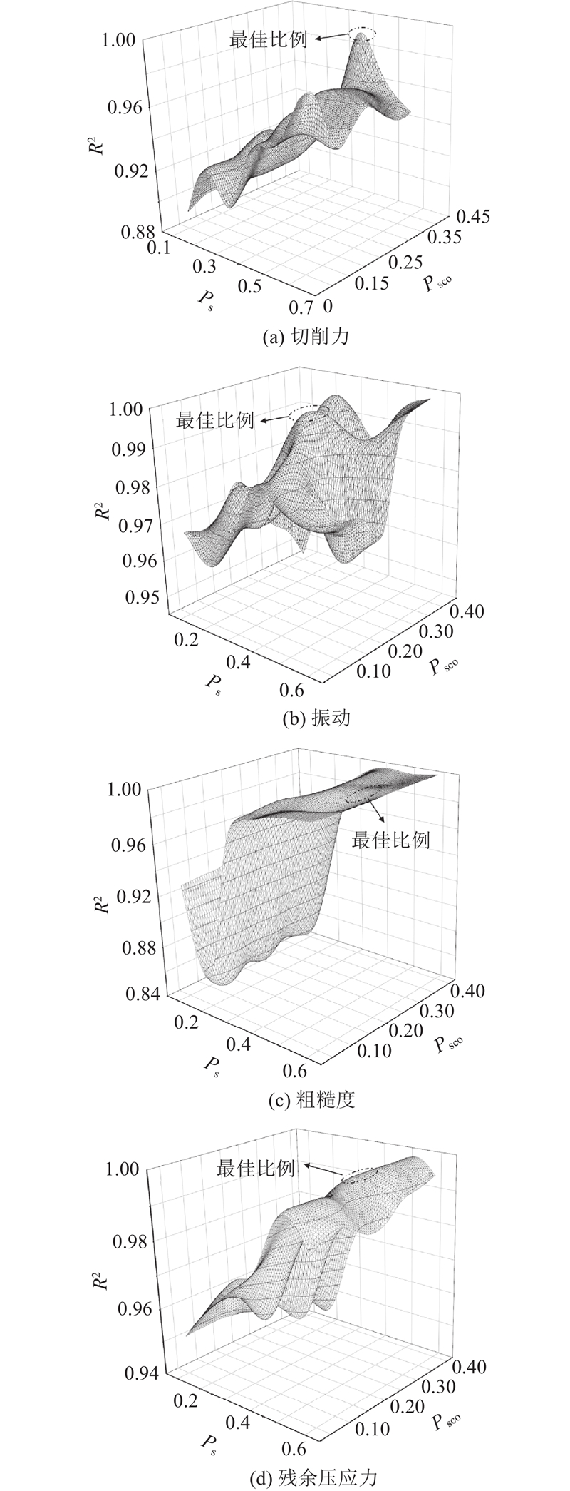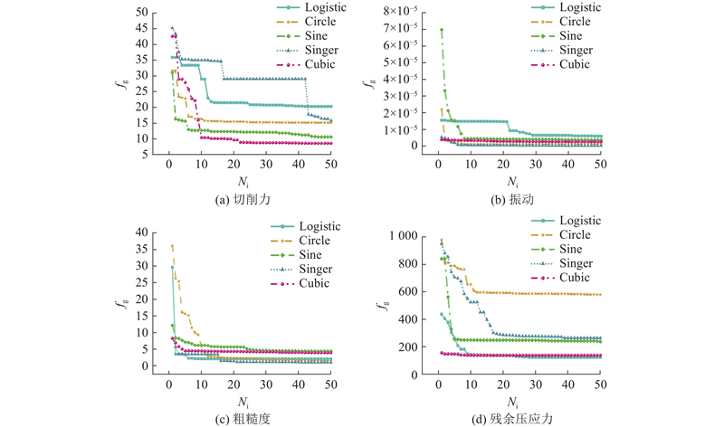 如图6所示,在建立的切削力模型中,当搜索者设置的比例Ps为0.30~0.40,警戒者比例Psco为0.35~0.40时,建立的模型预测性能更好. 在建立的振动预测模型中,搜索者的最优比例为0.30~0.35,警戒者的最优比例为0.20~0.25. 在粗糙度预测模型中,当搜索者比例为0.50~0.55,警戒者比例为0.25~0.30时,该模型显示出更好的性能. 在残余压应力预测模型中,当搜索者比例为0.40~0.45,警戒者比例为0.25~0.30时表现出更好的预测性能. 将混沌映射添加到已建立的模型中,完成最终的模型.