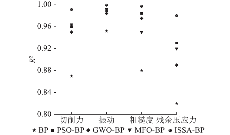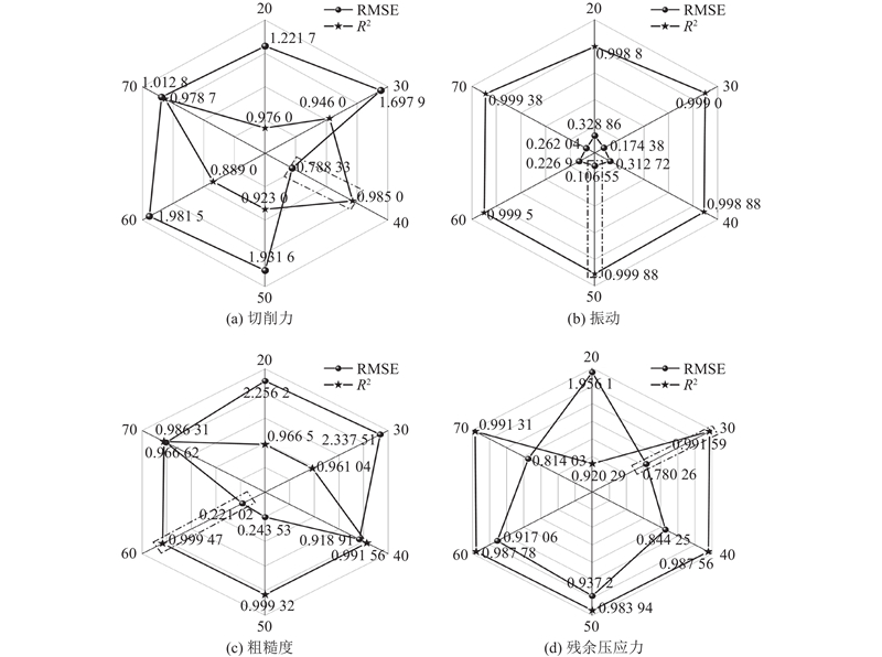 以切削速度、最大切削深度、刀具个数为输入,切削力、振动、粗糙度及残余压应力为输出,构建BP网络. 输入层节点数m为3,单个输出的输出层节点数n为1,所以隐藏层节点数为3~12. 遍历节点数,选择归一化训练数据的最小均方误差对应值作为最佳节点数,得到各模型的隐含层节点数为9、8、4、6. 设训练目标误差为0.000 1,学习效率为0.01,训练次数为1 000,隐含层用tansig函数,输出层用purelin函数,通过trainlm函数训练.