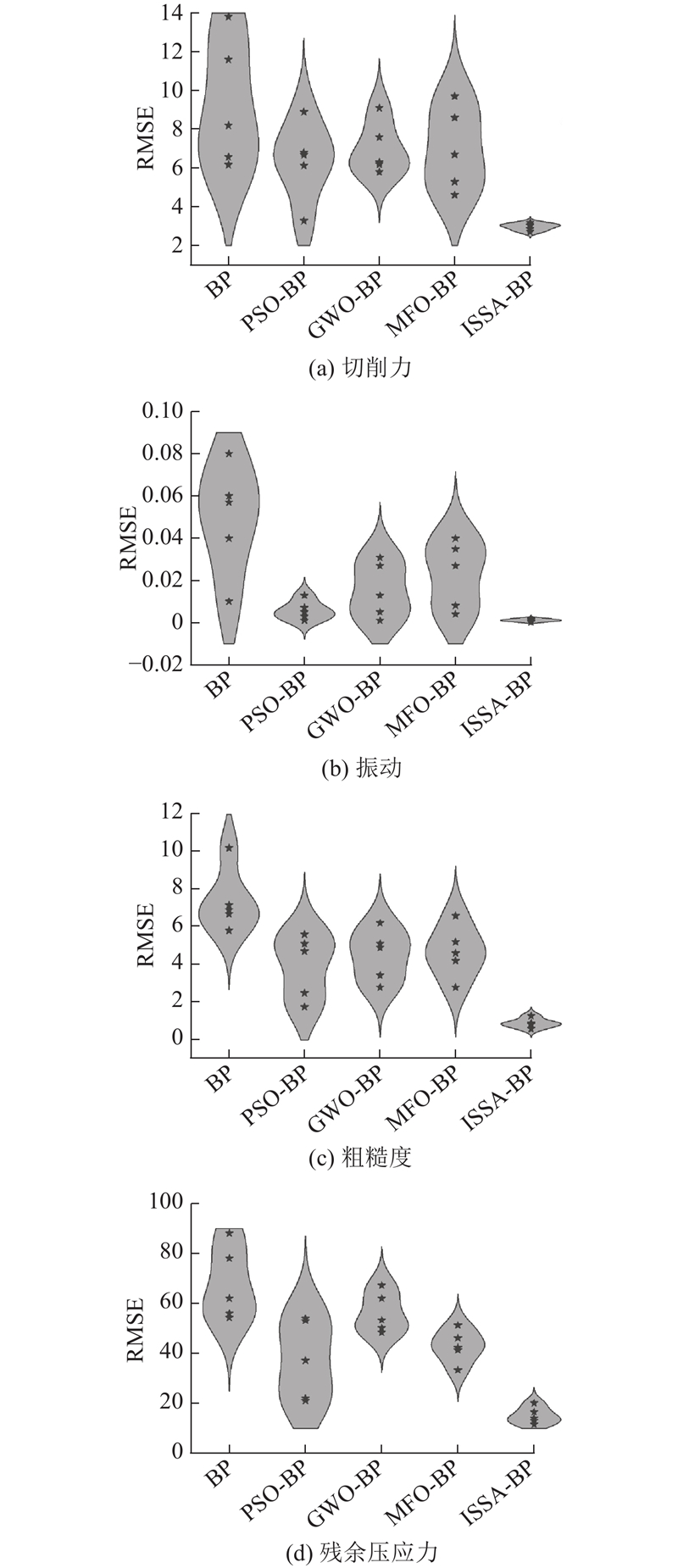 Fig.7 Violin plots comparing RMSE of five algorithms across four indicators