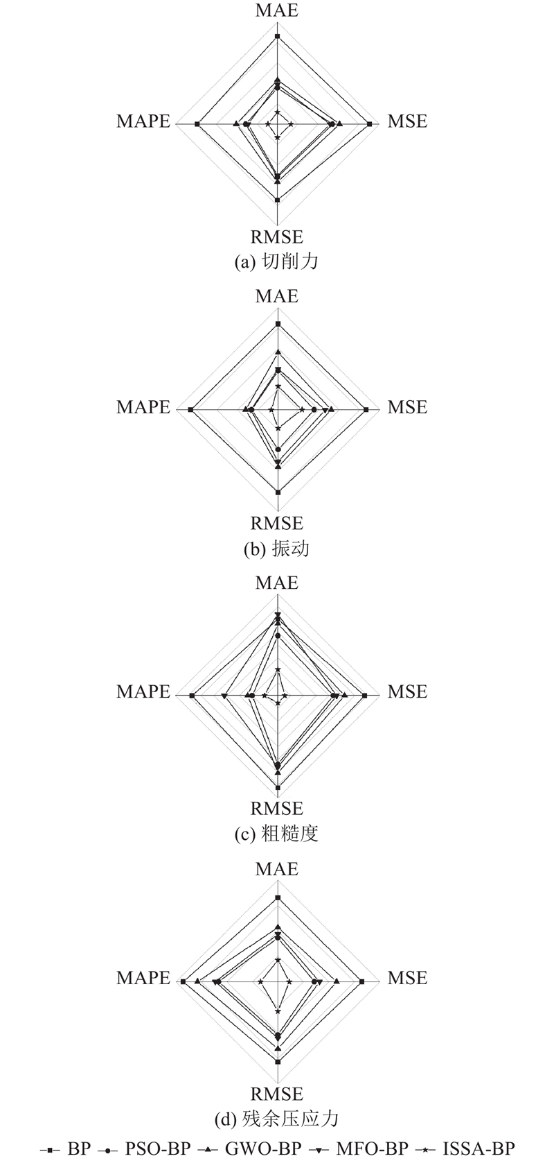 从图8可以看出,在建立的预测模型中,ISSA-BP模型在MAE、MSE、RMSE、MAPE方面表现出优异的预测性能.