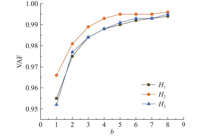 利用VAF提取有效的协同模式,结果如图3所示. 可知,当b = 2时,H1、H2、H3高度下的VAF分别为0.972、0.975、0.977,之后随着分解列数的增加,VAF的变化小于1%,因此认为当b = 2时分解结果最佳.