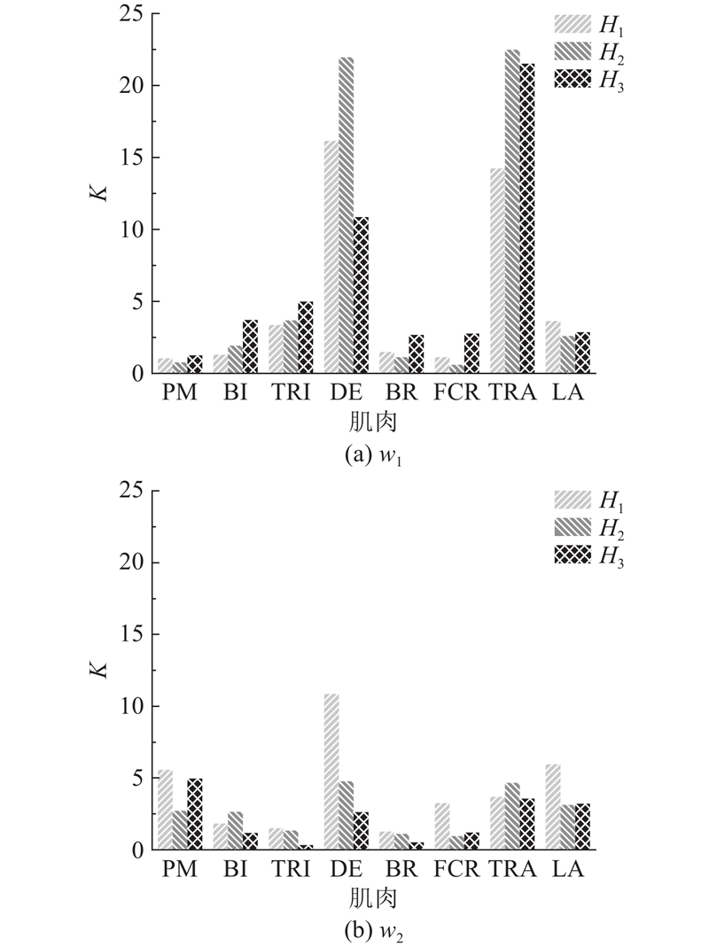 从表1可得不同高度下的w1、w2模式共同作用情况. 对不同高度下协同模式的肌肉激活系数和信息流出量进行显著性检验,显著性水平均大于0.05,表明不同高度下的协同模式无显著性差异. 其中不同高度下w1的协同肌肉均为DE和TRA. w2模式的协同肌肉略有不同,其中H1高度下的协同肌肉为PM、DE、LA,H2高度下的协同肌肉为PM、BI、DE、TRA、LA,H3高度下的协同肌肉为PM、DE、TRA、LA.