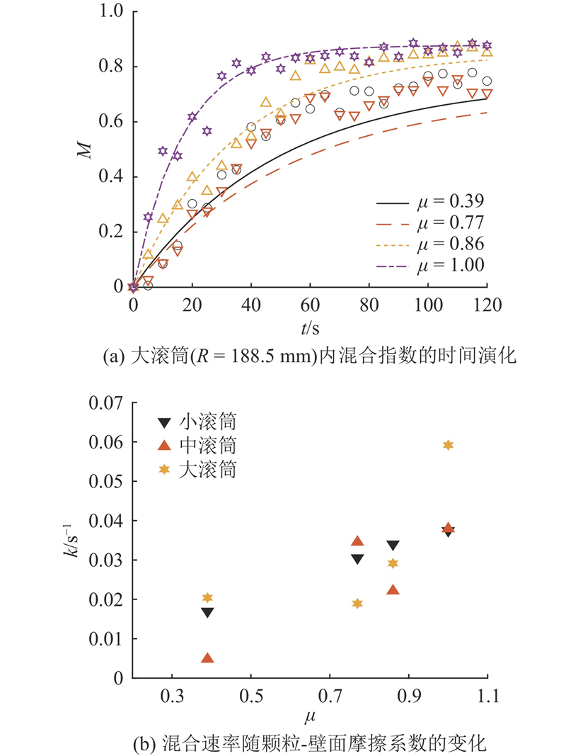 (2) 颗粒-壁面摩擦系数的影响. 当摩擦系数较小(如0.39)时,筒壁无法提供足够大的摩擦力抬升颗粒和促进系统产生剪切变形和运动,颗粒床以“固体”的形态在筒壁来回涌动,导致混合程度很低. 摩擦系数增大,则颗粒混合速率增长显著.