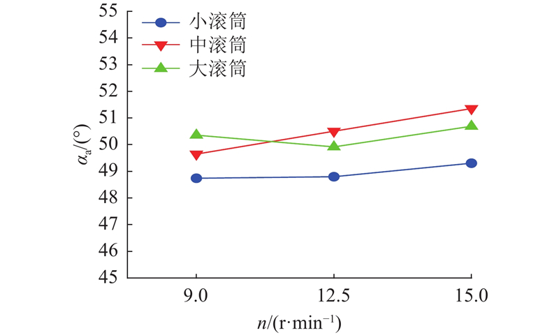 如图11所示,随着滚筒转速的增大,颗粒所受的离心力显著增加,使颗粒与筒壁之间的接触力进一步增强. 颗粒更容易被转动的滚筒抬升至更高的位置. 在中、小尺寸滚筒中,平均动态休止角随着转速增大呈现出单调递增的趋势. 在大尺寸滚筒中,平均动态休止角表现出先减小后增大的变化趋势. 这一现象归因于滚筒尺寸和转速的双重影响. 当滚筒尺寸和转速增大时,颗粒受到更强的离心力作用,而筒壁对烟丝颗粒的接触作用力随之增强,导致更多的颗粒发生破碎. 随着实验的进行,产生了更多长径比较小的颗粒,颗粒纠缠逐渐减少,休止角减小. 当转速足够大时,在惯性作用下,短颗粒能够被提升到较高的位置.